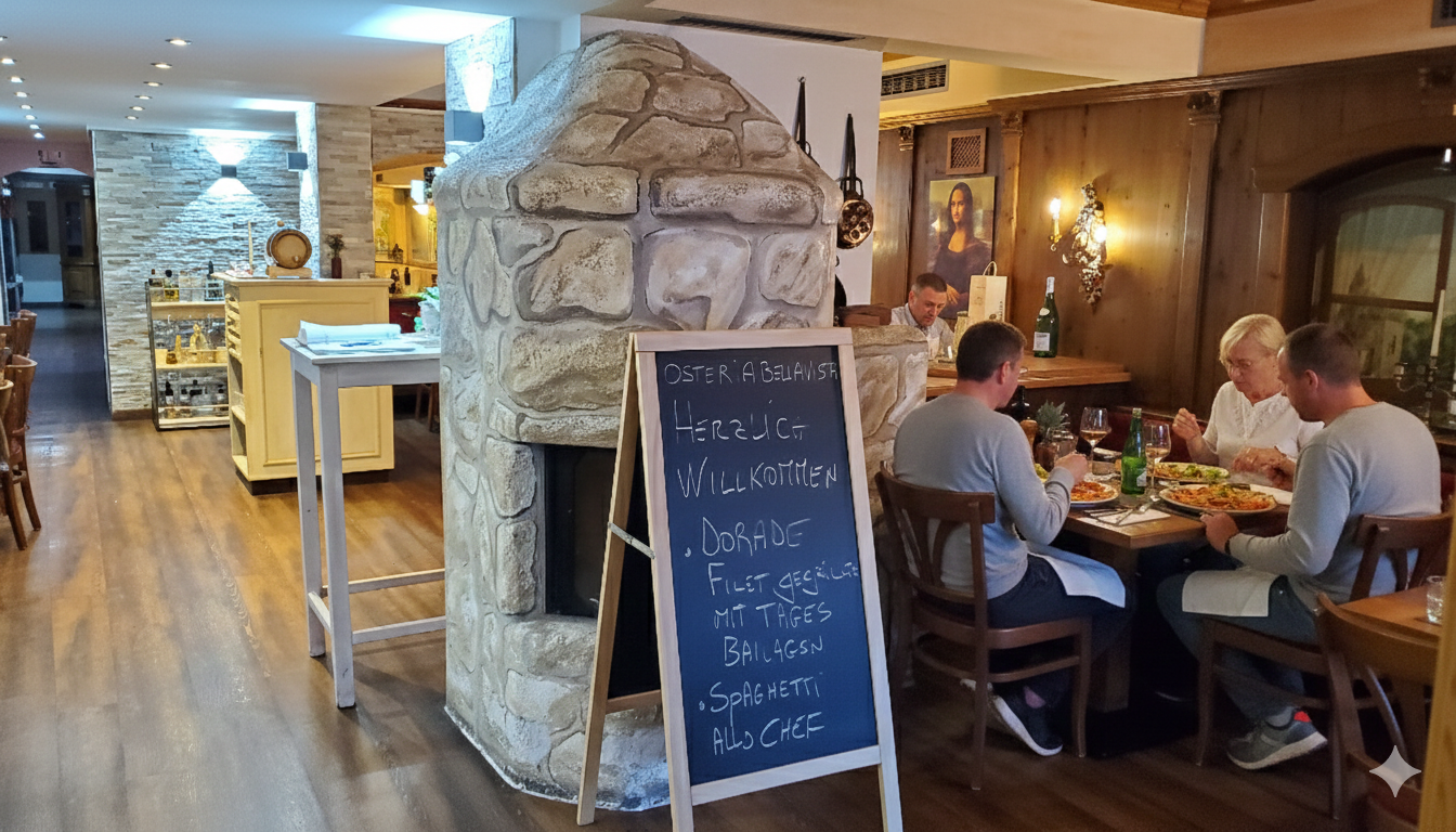 Die Osteria Bella Vista ist ein Restaurant, das schon beim Eintreten ein Gefühl von Ankommen vermittelt. Warme Farben, natürliche Materialien und ein Hauch mediterraner Leichtigkeit schaffen eine Atmosphäre, in der man gerne ein bisschen länger bleibt als geplant.